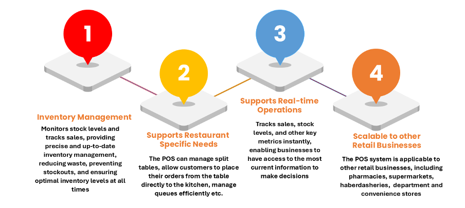The POS system includes several functionalities to improve processes in restaurants towards enhancing both operational efficiencies and customer satisfaction. The POS system allows restaurants to monitor stock levels and track sales, providing precise and up-to-date inventory management. It also contributes to customer satisfaction by providing features to support split tables, queue management and wait times as well as placing orders directly from the table to the kitchen among others.